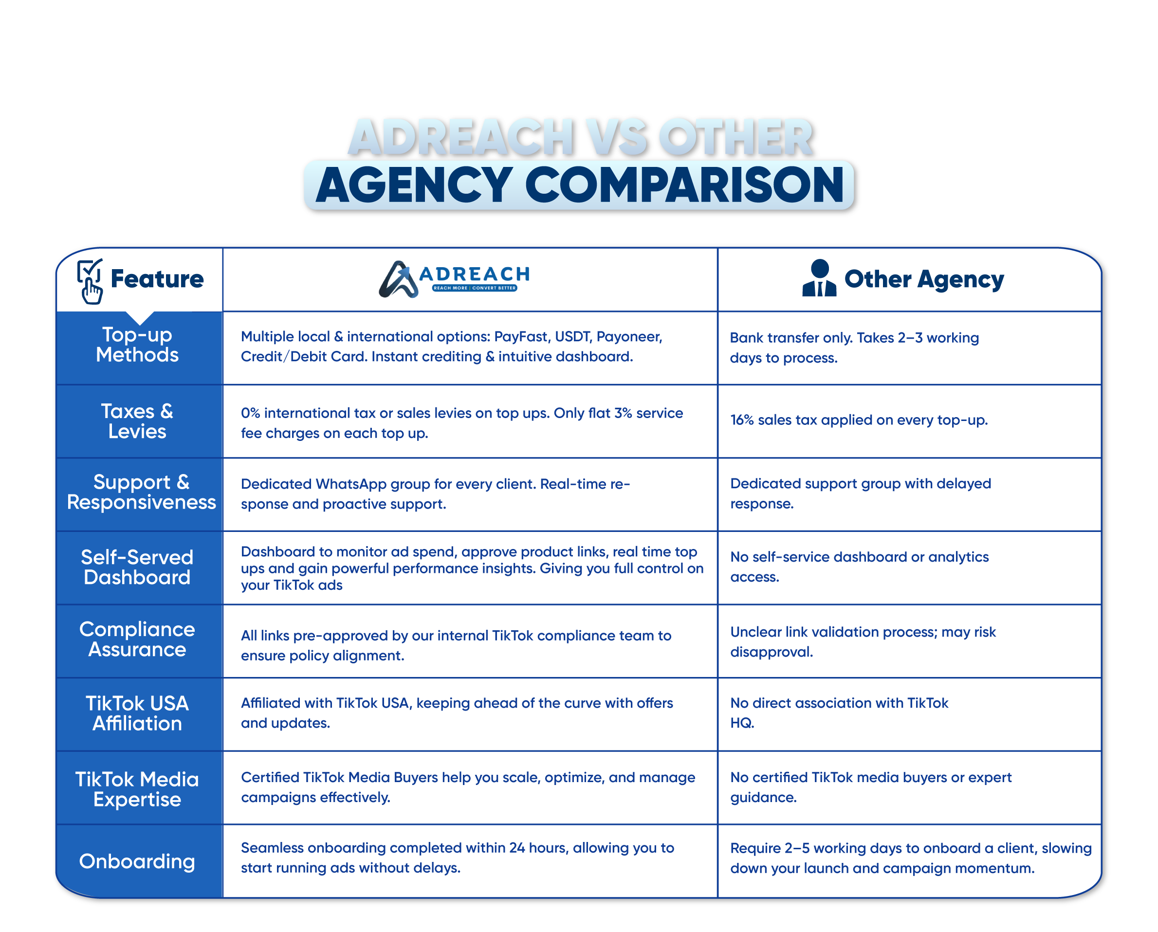 From fast approvals and seamless top-ups to dedicated account support and strategic guidance, we handle the operational complexity. With us you can stay focused on what matters most: building winning creatives, driving conversions, and growing your brand on TikTok.