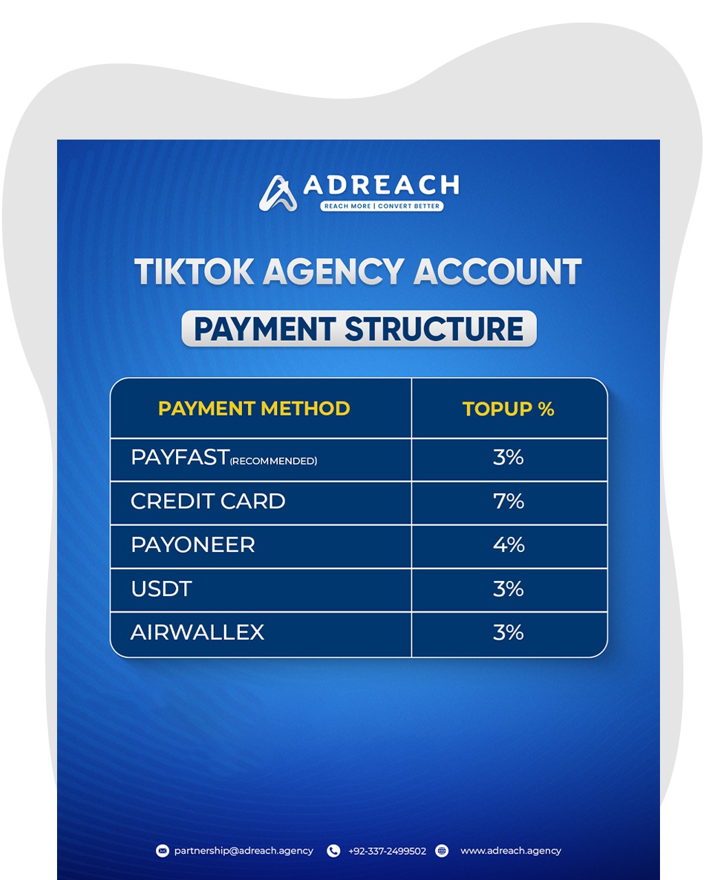 Top up your account instantly and securely in PKR, without worrying about taxes or cross-border complications. More focus on ads, less stress on payments.