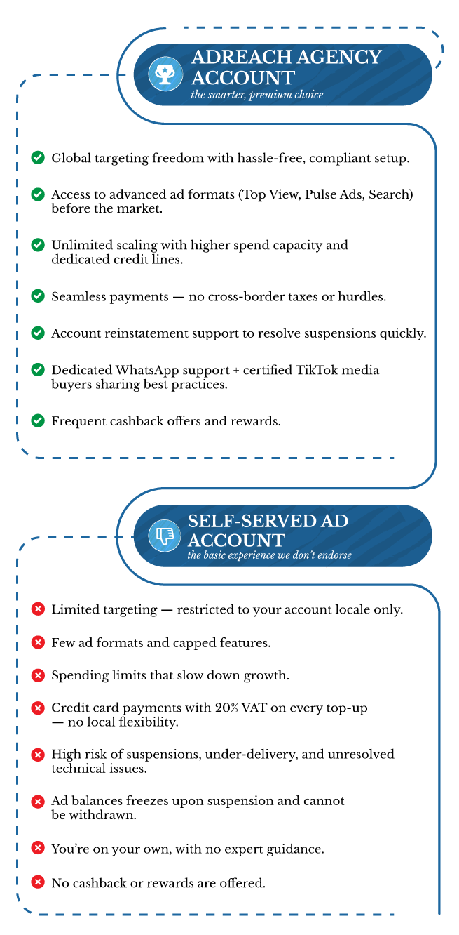 Sign up in minutes and let us handle the compliance and setup — no red tape, just smooth access to your TikTok Agency Account.