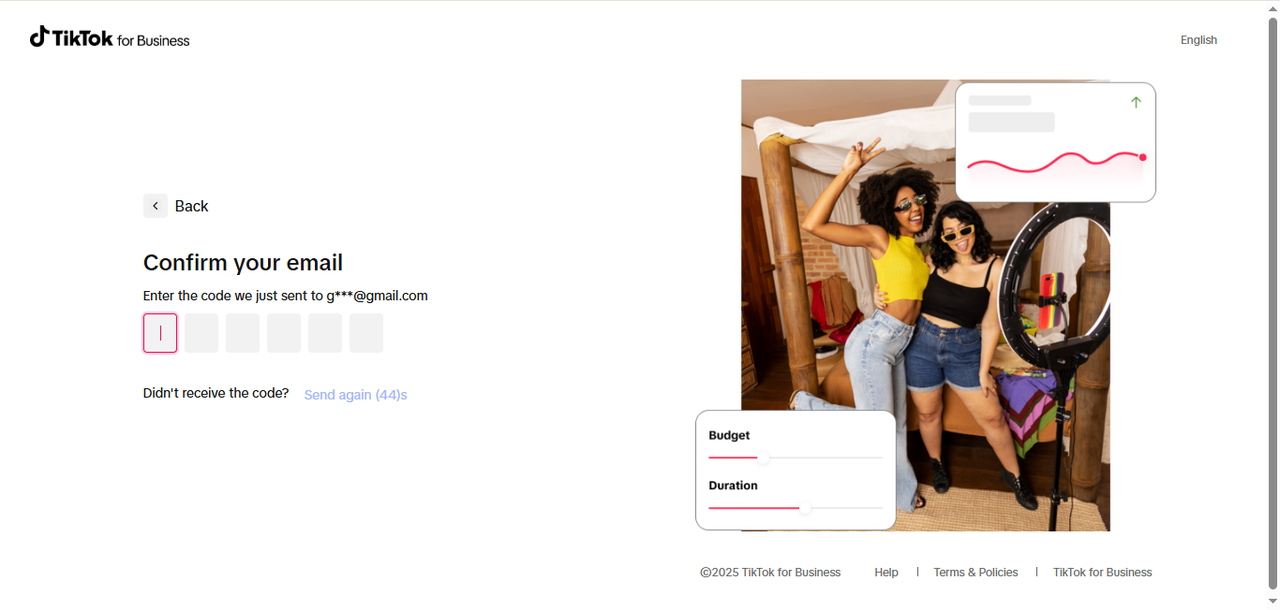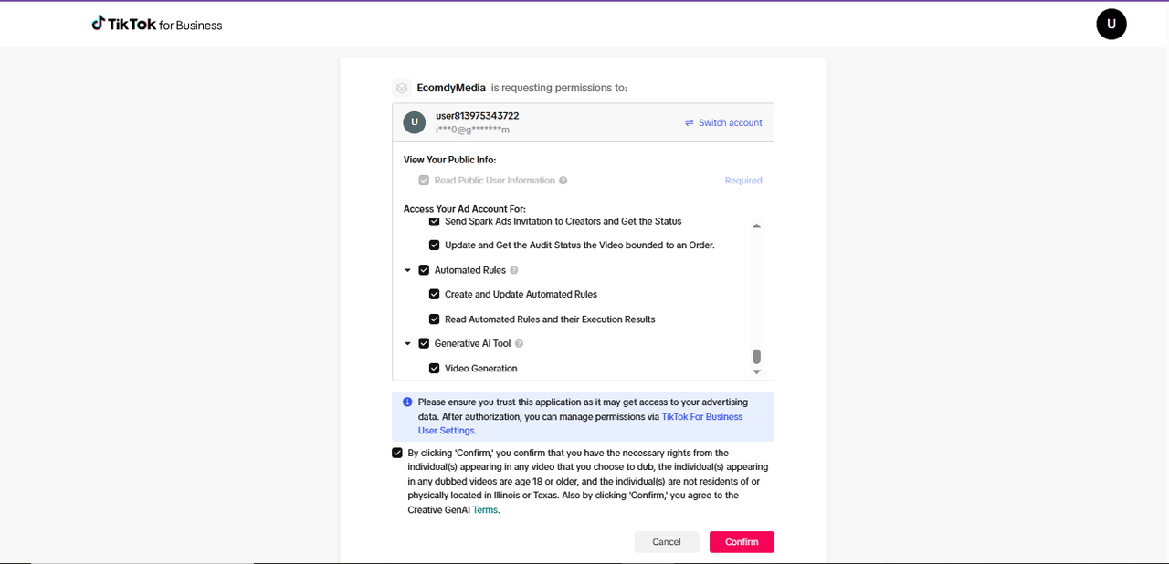 Agree to the permissions requested by TikTok and click “Confirm”. A 6-digit verification code will be sent to the email associated with your business account. Enter this code to verify your account.