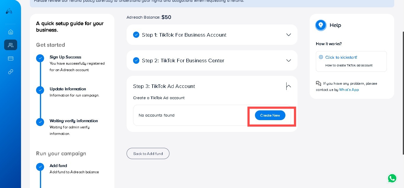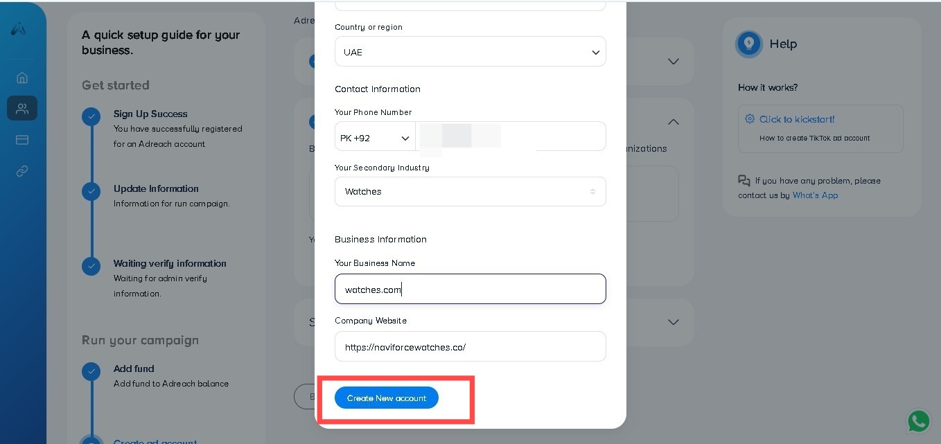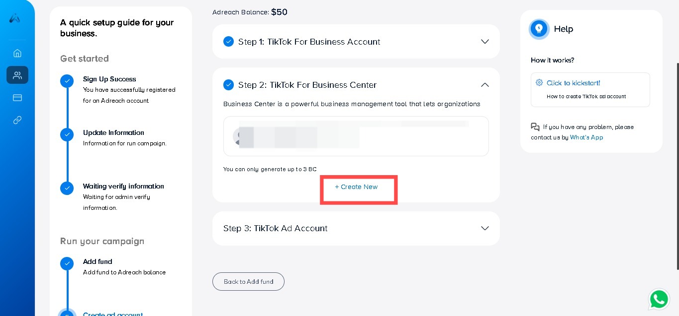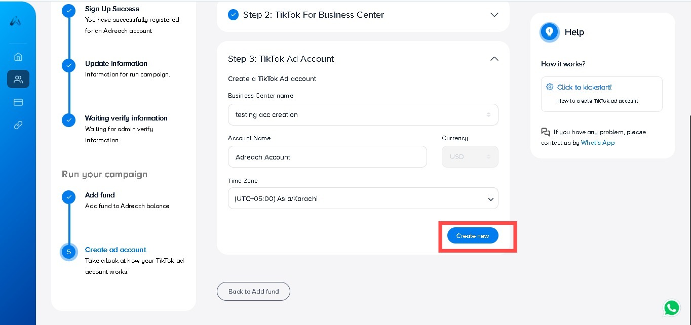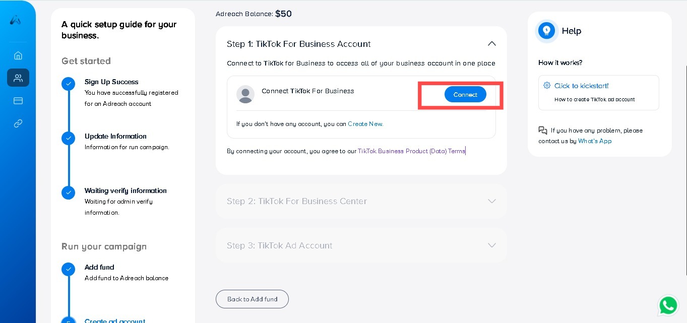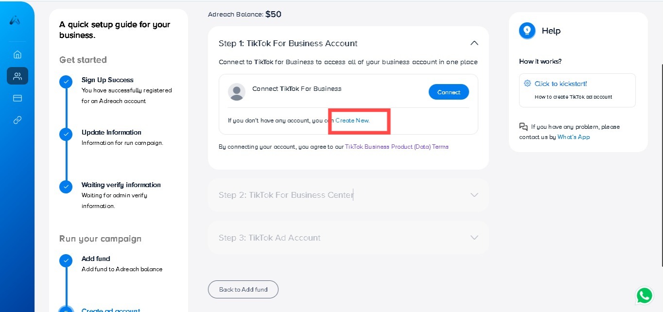 To begin, click on “Create New” TikTok For Business Account on the Adreach dashboard.