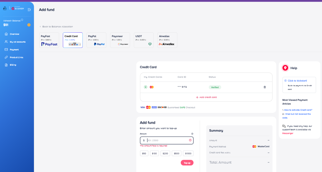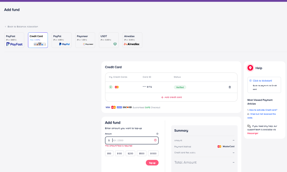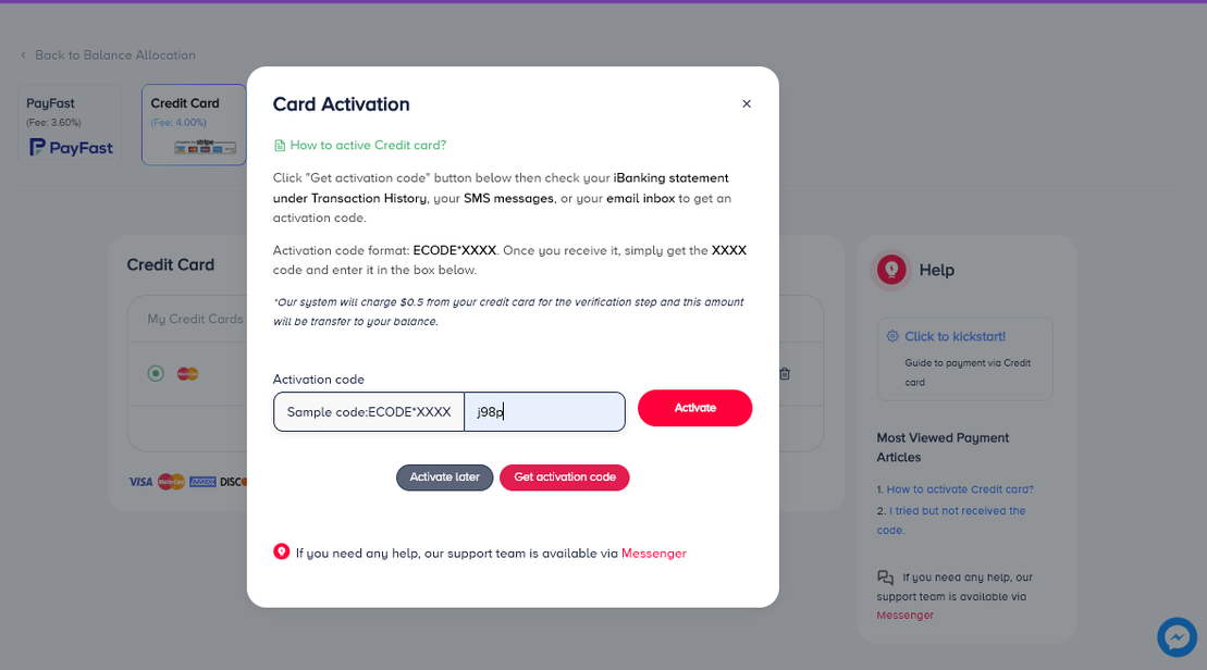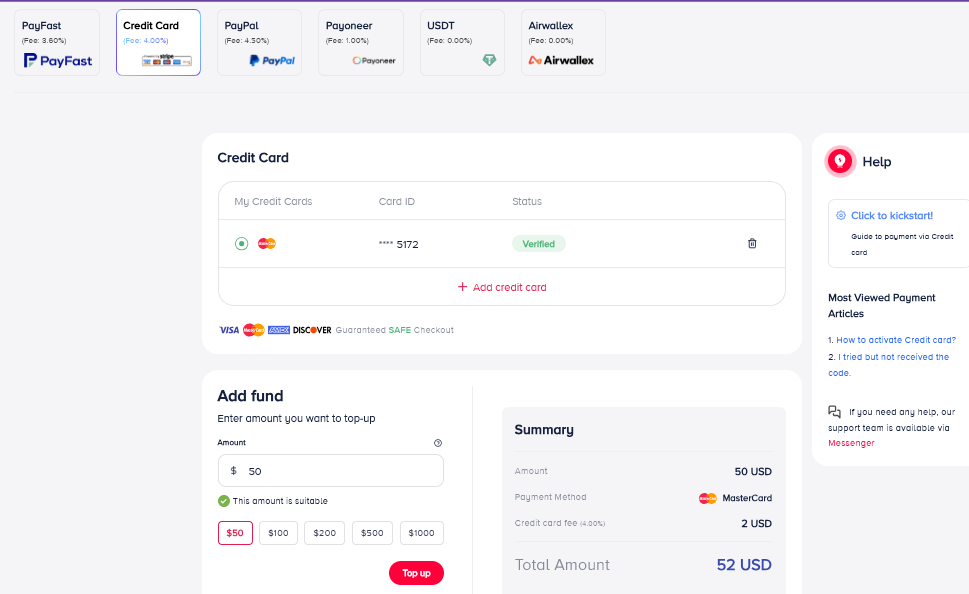 Thank you. If you experience any difficulties with topping up via credit card, please feel free to contact our support team for assistance.