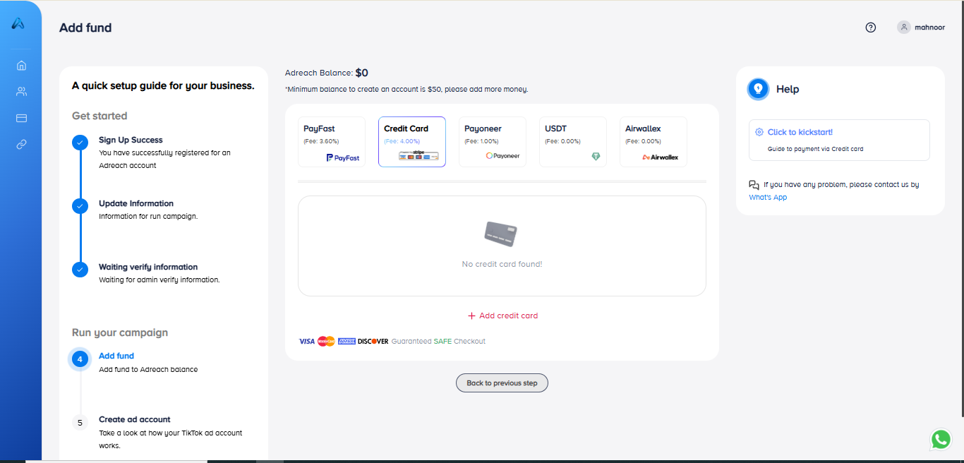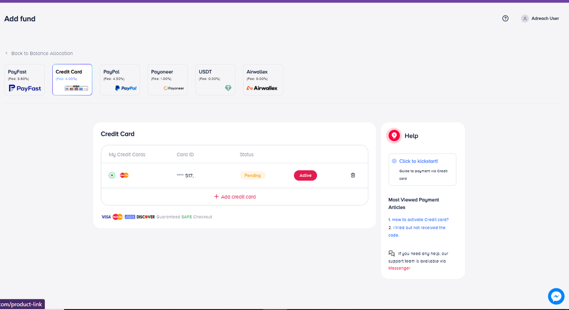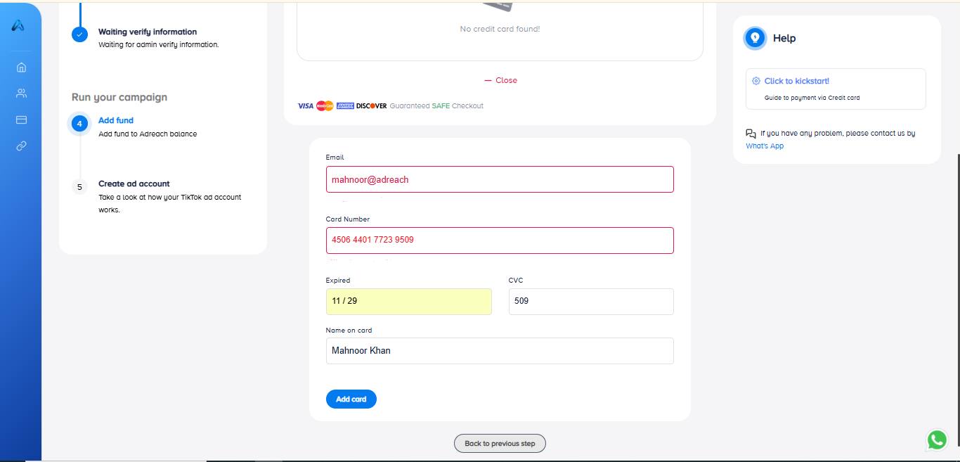 In case you want to add the second card (you added funds successfully and all your left bar was active), select “Payments” >>> “Credit Card” and do the same as your previous one.