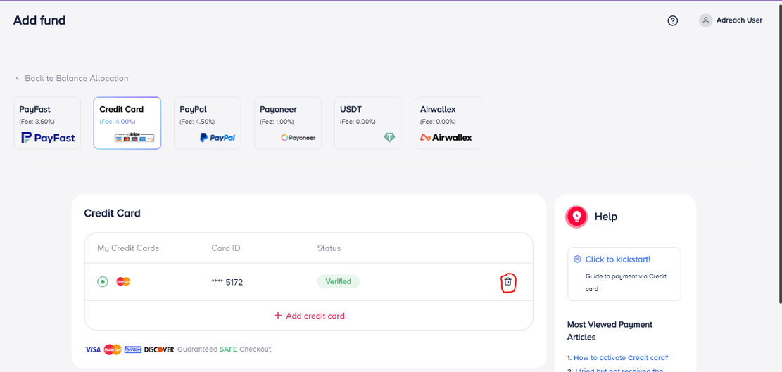 If you want to remove the credit card from our platform. Simply click on the bin icon showing on the right side, your card will be removed.