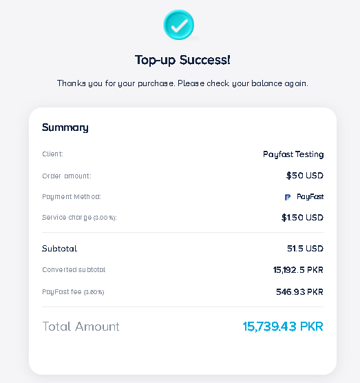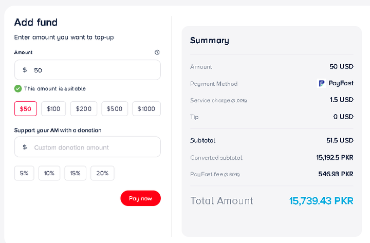 PayFast is the ideal top-up method for Pakistani clients, offering a seamless payment experience without international taxes, GST, or FED. With a simple flat fee of just $3 per top-up, you can fund your account cost-effectively. Enjoy smooth, hassle-free spending with maximum convenience.